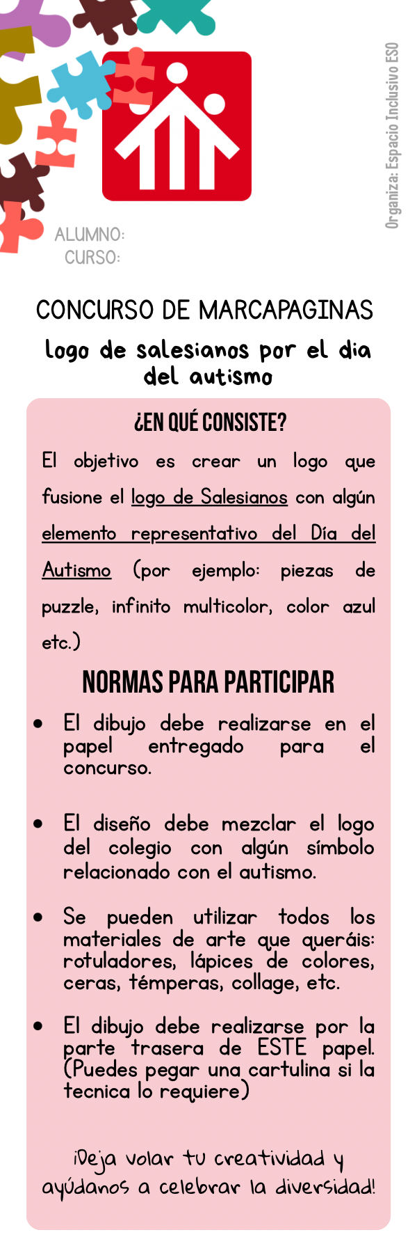 Con motivo del Día Mundial de Concienciación sobre el Autismo, desde Salesianos Domingo Savio queremos invitar a todo el alumnado a participar en una propuesta muy especial organizada por el Espacio Inclusivo de Secundaria: el diseño del marcapáginas oficial del colegio.